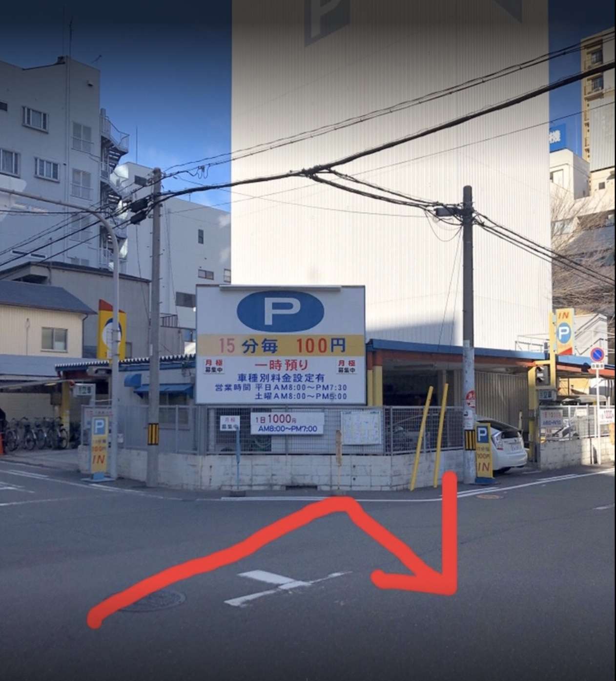 駐車場の看板が見えます。